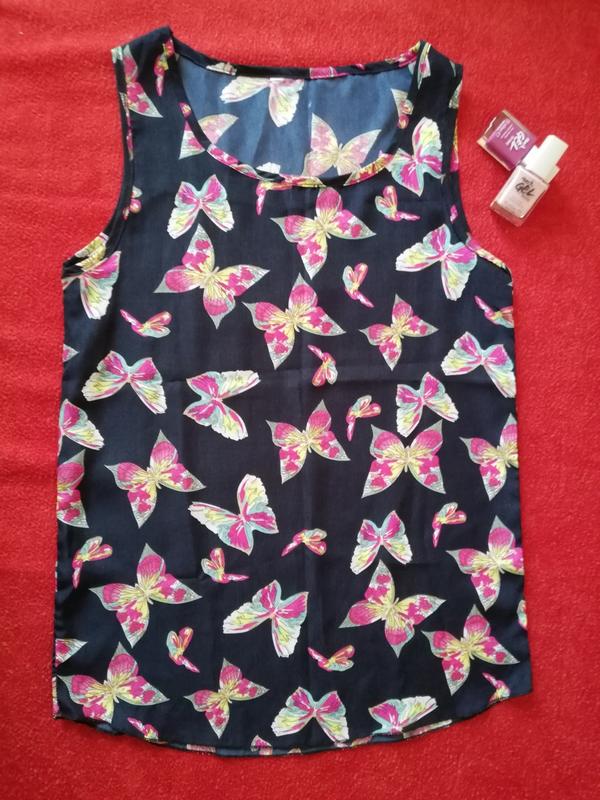 Состояние - идеальное , Размер - 2XS, XS, S. бирка срезана. Предлагаю замечательную шифоновую маечку! Цвет тёмно-синий с бабочками. Есть нюанс маленькое пятнышко на 4 фото внутри, с обратной со спины практически не заметно фото 5. Замеры: Длинна изделия от плечевого шва 59 см От бокового шва до бокового шва Полу обхват груди 41 см. Майка без выточек и застёжек. Низ покроен полукругом.