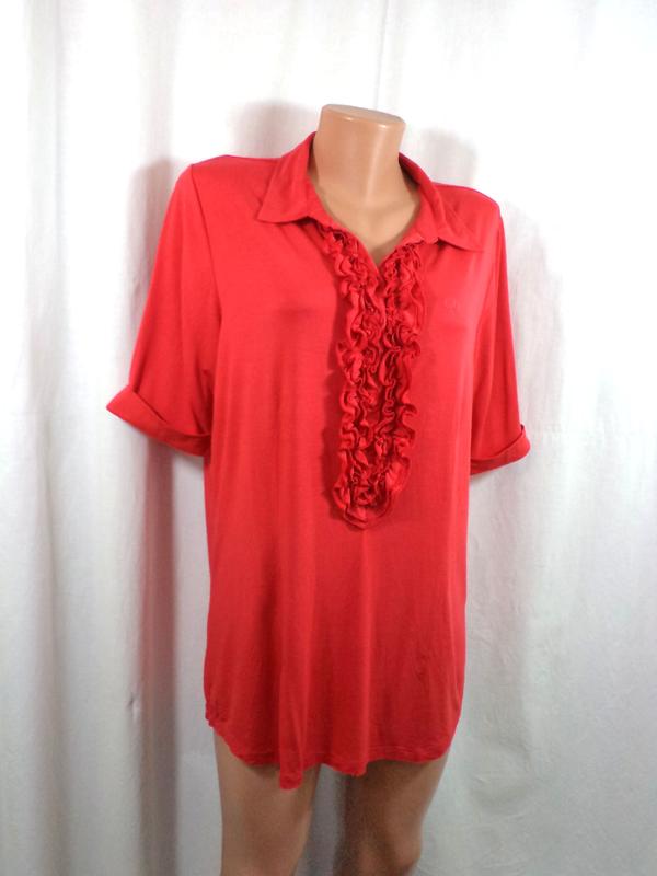Трикотажна футболка на 52-54 розмір! Фасон: Подовжена приталена футболка, рукави короткі з закотом, комір із планкою на ґудзиках, обробка планки — об'ємний рюш Колір: кораловий (червоно-жовтогарячий) Склад: тонкий стрейчевий трикотаж,віскоза — 95%, еластан — 5% Розмір вказаний XXL, приблизно 52-54- наш. Фірма RIVER WOODS Довжина — 72, напівобхват грудей — 52-62 см, напівобхват талії — 48-58 см, довжина рукава — 30 см Стан — чудове!