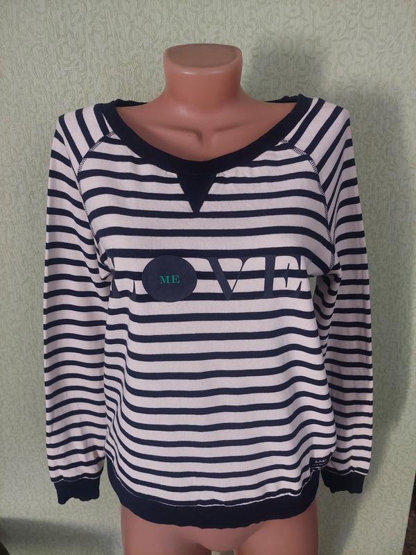лонгслів (світшот) в синьо- білу смужку із висоякісної пряжі 100% котон, в'язаний щільною простою в'язкою, горловина низ і манжети фактурна обв'язка резинкою, на грудях прин LOVE ( прорезинений накат), модель вільного крою ( не в облипку), круглий виріз горловини, рукав по типу реглан ьвіл горловини 72, груди ПО 51, низ 42, довжина по спині 60, заміри зроблено в спокійному стані, вміру тягнеться, вказаний розмір М, добре і на С, орієнтуватися по замірах.