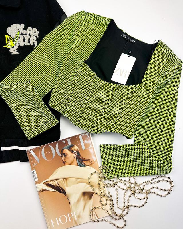 Черно салатовый топ с длинным рукавом в гусячую лапку