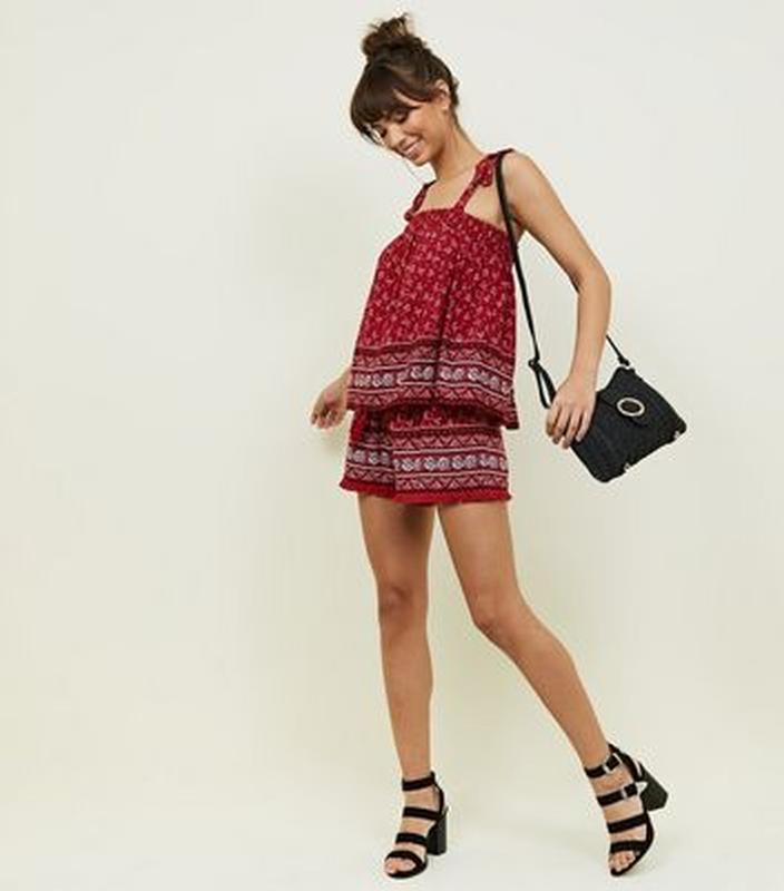 Стильний топ на бретелях у формі зав'язок від бренда New Look. Виготовлено з легкої 100% віскозної тканини темно-червоного кольору з дрібним квітковим принтом і бордюром по нижній частині. М'яка віскозна тканина дає змогу тілу «дихати» і дуже приємна до тіла. Бретелі (зав'язки) зафіксовані та не регулюються. Вказівний розмір 38/10 (M). Заміри: Ширина по верху (там, гда гумки) 33-34 см (тягнеться до 50 см) У грудях вільно (приблизно 60 см) Довжина від плеча до низу 56 см Зріст Larissa (дівчина на фото) 176.5 см, носить UK 10/EU 38/US 6. Склад: 100% віскоза. Стан нової речі.