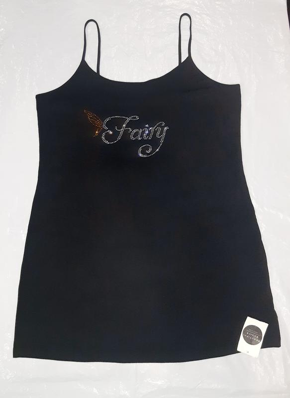 Стильний класичний чорний топ/майка із ефектним декором на грудях, виконаний з різнокольорових стразів. Нова, із ярликом. Виконана з тонкого еластичного трикотажу. Модель із надзвичайно комфортного матеріалу з бавовни і еластану. - Приталений фасон. - Модель на бретельках. - Модель з декоративною аплікацією із стразів. - Довжина: 70cm. - Ширина під пахвами: 50-56cm. РОЗМІР: 20/52-54 Склад: бавовна, еластан