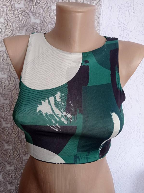 Розмір вказаний 8. Стан ідеальний. Склад: 95% поліестер,5% еластан. Заміри: ПОГ-34 см, плечі — 23 см, Пониза — 30 см, довжина — 37 см (топик тягнеться). Світлина на тілі немає. Пересилання.