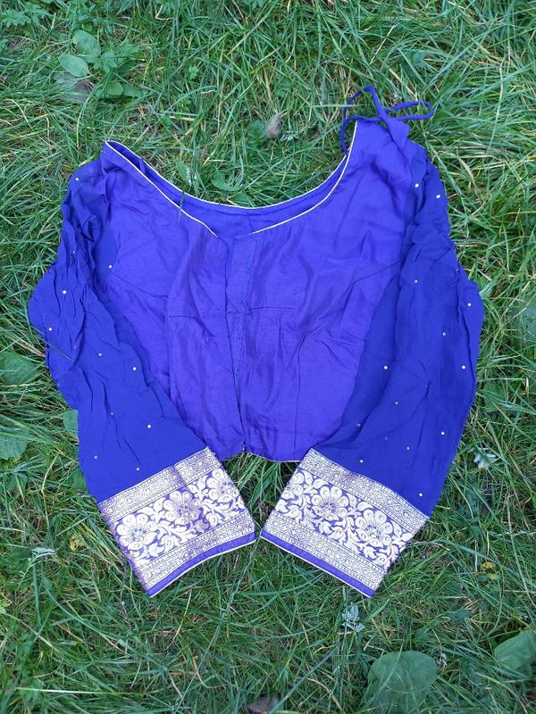 Чолі синьо фіолетового кольору, гарно закриває спинку, рукава шифонові, є запаси по бокам і в рукавах. ПОГ 49 см, знизу ПО 40 см, ловжмна 39 см, рукав 52 см. Дивіться схожі мої обяви.