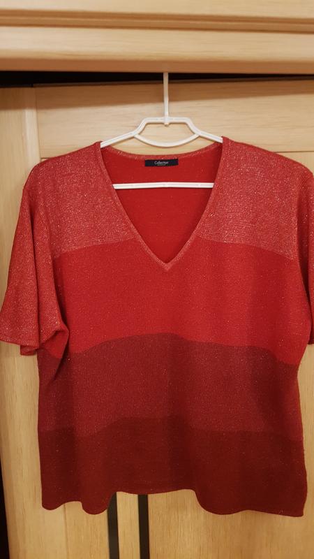 На розмір 52-54 ( на фото розмір 48-50 і блуза велика) . Довжина 63см ПОГ 56см плечі 45см рукав 25см , навівширина низу 60см. Має святковий блиск люрексу. Розвантажуємось. Дивіться інші мої пропозиції.