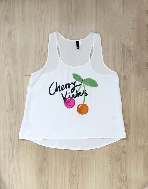 Легкий топ з віскози з яскравим і соковитим принтом Cherry Kicks. Спинка виконана борцівської. Передня планка внизу пряма, задня - злегка закруглений. Мінімальні виточки дозволяють виробу ідеально струмує, не топорщась в області пройми. Розмір вказаний 10. Фактичні виміри в розслабленому стані (не на тілі): - напівобхват грудей - 49 см; - напівобхват низу - 59 см; - довжина виробу спереду/ззаду - 58/64 див. Приємної Вам покупки!)