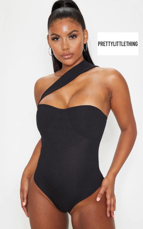 Чорне боді в рубчик із ремінцем через плече prettylittlething