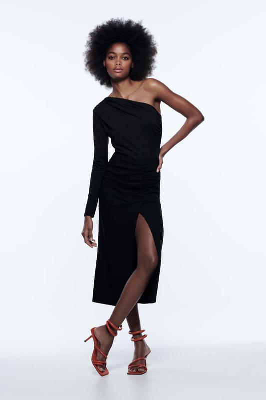 АСИММЕТРИЧНОЕ БОДИ СО СБОРКАМИ ЧЕРНЫЙ Боди с асимметричным вырезом, длинными рукавами и сборками по бокам. Застегивается на кнопки снизу.