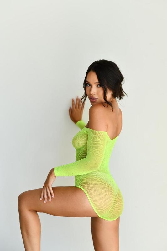 Неймовірно сексуальне боді з камінчиками Склад: 95% поліестер та 5% еластан. Матеріал: італійська сітка. Добре тягнеться. Розмір один S/М Розмірна сітка: S/M: груди 82-97, стегна 88-98