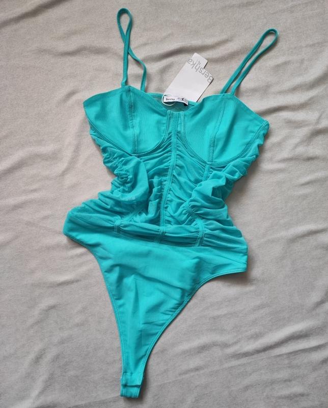 новий з біркою розмір указано S, але краще на XS. В чашках і трусиках тканина подвійна, в інших місцях сітка,що просвітлює.