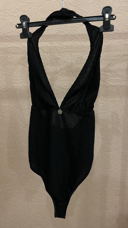 Боді чорне Guess розмір S, з люрексовою ниткою, на підкладі-сіточці, з відкритою спинкою.