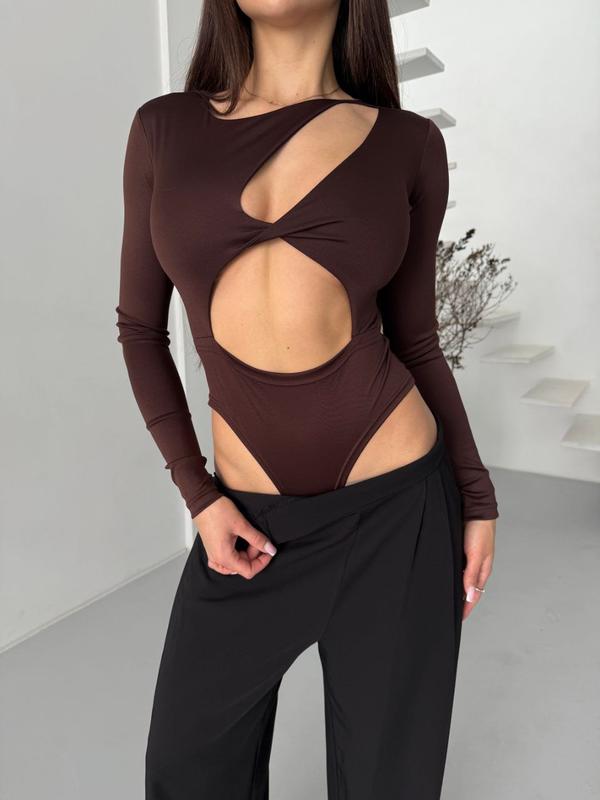 Жіночий відвертий смілий відкритий боді із декольте довгий рукав шоколад коричневий