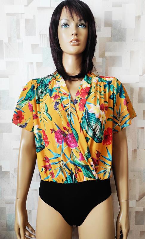 Увага!!! - Не оформляйте замовлення, не уточнивши всю інформацію по товару, а також спосіб оплати та доставки! Читайте уважно опис та заміри перед покупкою! Стильна гірчічна блуза боді на запах з квітами, розмір вказано С. Півобхват грудей 47 см, регулюється запахом, вільна талія, внизу на резинці, плавки на кнопках, довжина 72 см, рукавчики-крильця, стан ідеальний!