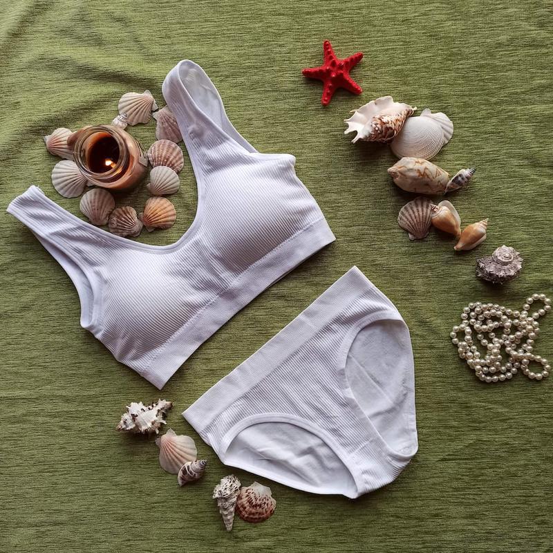 Безшовний комплект (без швів по бокам) з широкими бретельками, трусики - сліпи. Два паралонових трикутничка всередині топа, які можна витягнути. Комплект дуже зручний та гарний. Матеріал – 92% поліамід, 8% еластан Розміри: M/L/XL M: чашка – A/B/С, об’єм під грудьми- 75-80, трусики – 42/44 (на груди +- 80-90см, бедра +-80-90см). L: чашка – A/B/С, об’єм під грудьми – 80-85, трусики – 44/46 (на груди +- 85-95см, бедра +-85-95см). XL: чашка – A/B/С/D, об’єм під грудьми – 85-90, трусики – 46/48 (на груди +- 90-110см, бедра +-90-110см). Надаємо таблицю розмірів виробника, але по зворотньому відгуку від клієнтів комплект більшемірить (особливо топ), тому пишемо вище плюс-мінус розміри в сантиметрах. Кольори: білий, бежевий, бордо (не такий яскравий як на фото), чорний. Заходьте до мене в шафу, підписуйтесь, величезний вибір топів. При купівлі 2-х одиниць - знижка 10%, при купівлі 3-х одиниць - знижка 10% + подарунок.