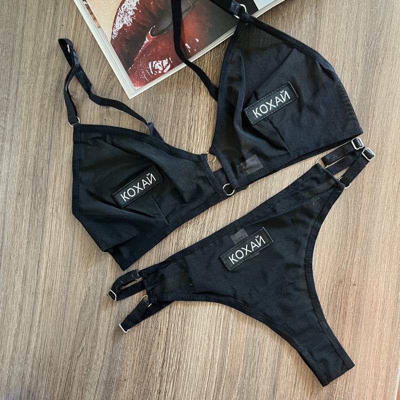 Такий комплект має бути у кожної тому, що це просто підпал🔥 Комплект виготовлений з еластичної сіточки, тому сідає просто ідеально. Топ має застібку на 2 гачки та регулюючі шлейки. Трусики мають бавовняну підкладку та регулятори по бокам. А ці гарячі надписи точно не залишать байдужим Вашу другу половинку😉 Є різні написи: Кусай, Цілуй, Люби, Кохай, Знімай Розмір: Топ 70 АВС, 75 АВ, 80 АВ, 85 АВ Трусики на обʼєм стегон до 105 см Колір: чорний 🏷️ 420 грн