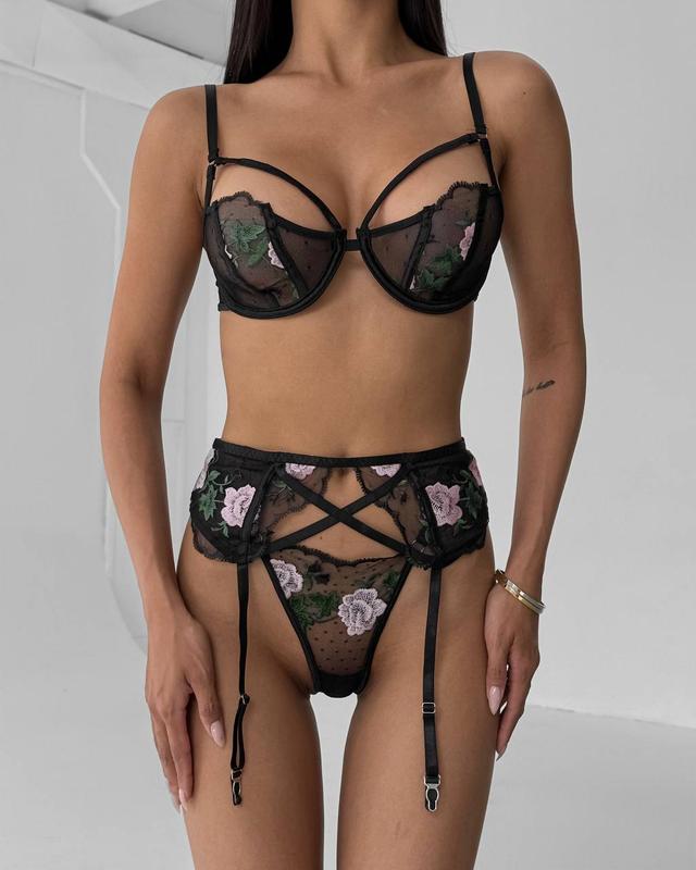 Еротичний комплект з вишивкою 3в1 бюст з портупеєю, трусики, пояс