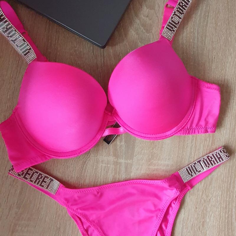 Яскравий, сочний малиновий колір, супер пуш ствопює ефект силіконових грудей. Розмір 80в трусики л. Брителі декоровані стразами