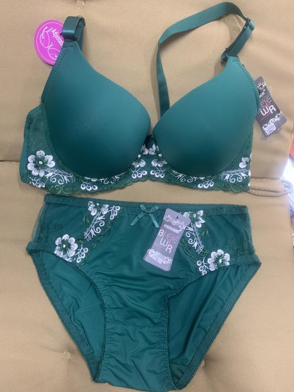 Комплект нижнего белья темно-зеленого цвета (фото немного другой оттенок передает). В размере 85D: глубина чашки по высоте 15см, по ширине 18см, длина лодыжки 22,5см, высота соединения между чашками 6см, высота боковой косточки 8см, ширина под грудью 35-38,5см. Трусики в размере L: глубина посадки спереди 24см, сзади 25см, ширина пояса 31,5-39см, длина бокового шва 8см.