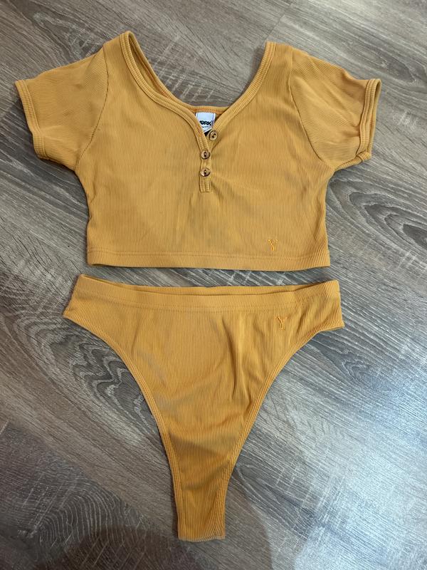 Комплект жіночої білизни / домашнього одягу (топ і трусики-стрінги) у рубчик, гірчичного/оранжевого кольору. Розмір верх 36, низ 42