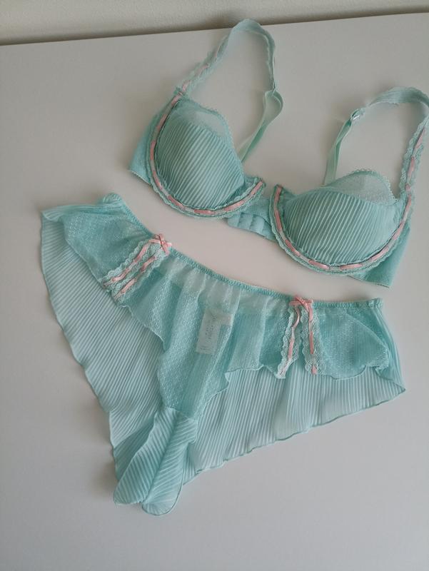 Чашечка на косточках, балконет, полуоткрытая, пооумягкая, есть тонкий поролон Ширина 17,5, высота 11,5 Пояс бюстгальтера в спокойном состоянии 67, в натяжении до 87 Трусики размер 12/46 Талия 33 Высота 22