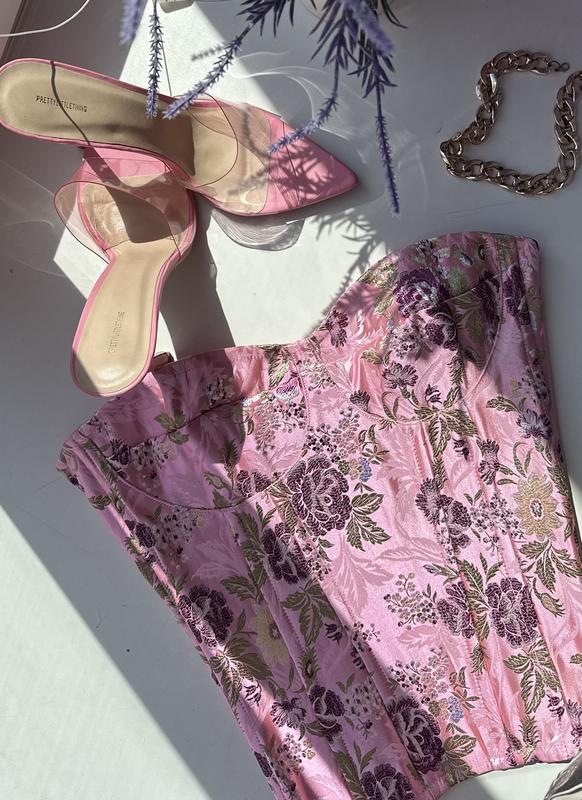 Атласний корсет з рожевого квіткового жаккарда Розмір С-М 38 33 см довжина 37 см талія (напівобхват) 41 см верх груди