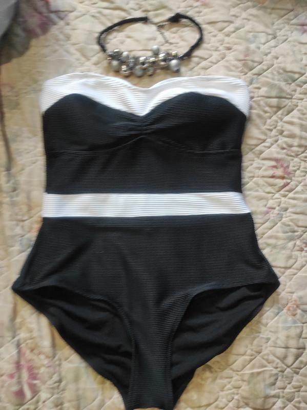 Класний стильний рельєфний купальник з пляжем пляжний басейн. Колір чорний, по грудях та під грудьми біла смужка. У грудях паралонові вставки без кісточок та швів. По животу сітка утяжка, що дозволять приховати животик, тканина супер, рельєфна. Дуже красиво стильно виглядає, дуже стрункий! Розмір на 48-50 чудово тягнеться! Виміри скину. Ідеальний стан і якість, єдина втрачена бретелька через шию, легко замінити. Пересилаю. Запитання в особистому повідомленні. Запитуйте більше запитань краще! Дивіться також інші оголошення. Є багато інших купальників боді корсетів гетрів топів та інших цікавих речей! Удачі всім!