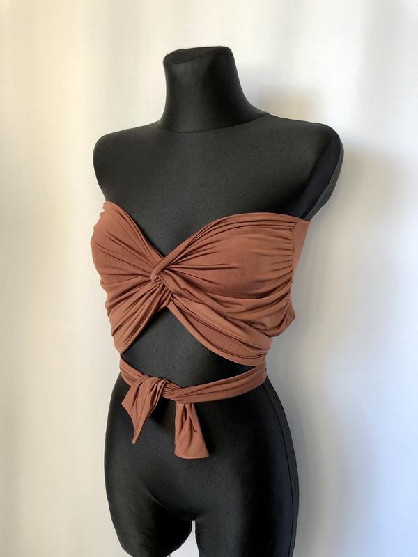 Коричневый топ верх от купальника на длинных завязках. Размер указан 40, подойдет примерно на на М. Без чашек. Можно завязать множеством разных способов