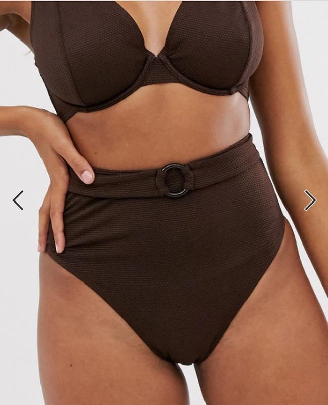 фірмові актуальні плавки з високою талією! тканинні, рельєфні приємні та м'які на дотик! насиченого шоколадного кольору. спереду вшитий декоративний ремінець із кільцем, добре сидять на тілі, повністю продубльовані підкладкою. Модель плавок чудово підійде і для басейну, оскільки має спеціальну якісну анти хлорову та антисольову тканину. модель Peek & Beau Exclusive high waist bikini bottom with tort belt in coffee rib розмір 12-14/мл/40-42/ наш це 46-48/заміри — піт 39/соб 43/посадка 37/ висота збоку 13,5/ Аутлет НОВІ з етикеткою.