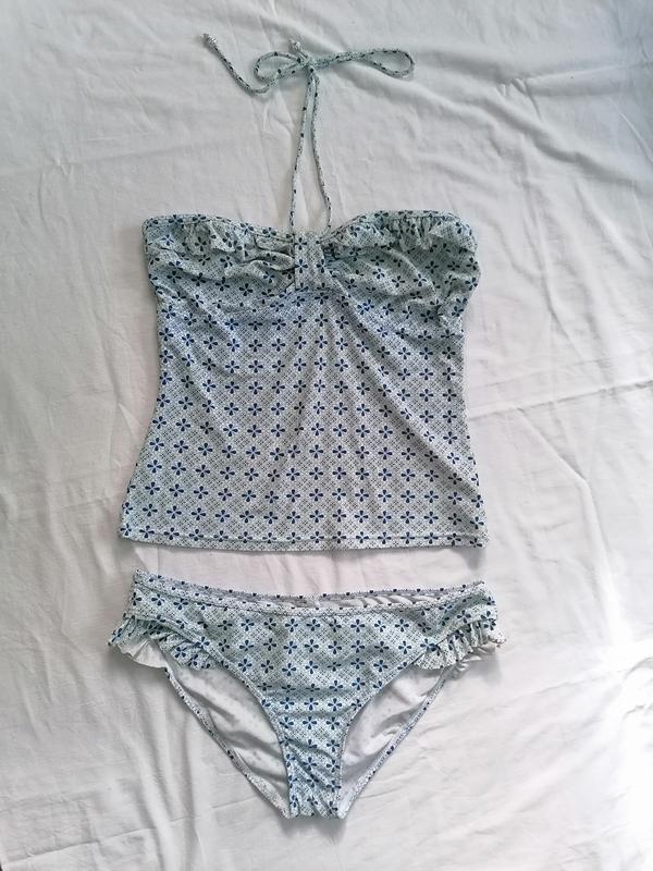 Жіночий купальник танкіні з рюшами. На топі є вставки під вкладиші. Трусики спереду на підкладці. Нюанси: є рожеві маленькі полинялі плямки на топі та трусиках (майже непомітні). Під грудьми яскравіший колір. В одному місці на топі трохи розтягнена тканина (ззовні не помітно). По підкладці трусиків є стрілки (також ззовні не помітні). Всі нюанси показала на останніх 5 фото. Якщо виникнуть питання, пишіть. Написаний розмір 14. Заміри: Довжина топа від пахви до низу 38 см Груди 40 см Талія 38 см Низ 44,5 см. Трусики по поясу 41 см Высота 25 см +/-