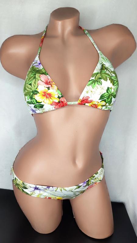 Купальник роздільний Yamamay Білий з кольоровим М (46) Роздільний купальник б/у (ліф + труси) від бренду Yamamay Іспанія Купальник на зав'язках (на шиї та спині). Ліф – трикутники, всередині змінна поролонова підкладка. Плавки: Сліп Колір основний: Білий Принт: великі квіти кольорові Розмір: М (український розмір 46) Виміри ліф: Чашка В/75 Трикутники: довжина – 16 см, висота – 17 см Труси: Напів обхват стегон – 41 см Висота посадки – 22 см Довжина бокового шва – 3 см Склад: 82% нейлон, 18% еластан підкладка – 100% поліестр