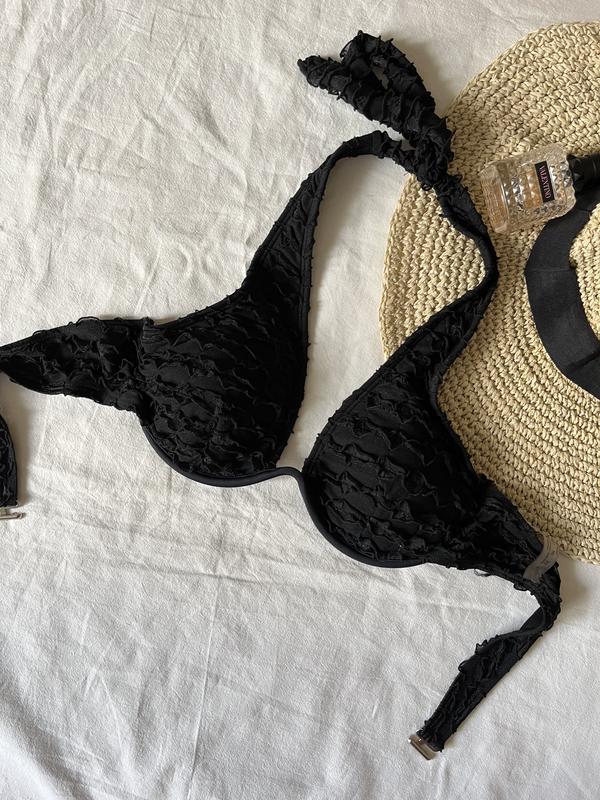 Шикарний чорний верх від купальника На кісточках та має вкладиші Гарно на тілі Розмір л, на обʼєм 85-90 Ідеальний стан Довжина по низу 81-95 Ширина чашечки 15 Є різні варіанти низу!