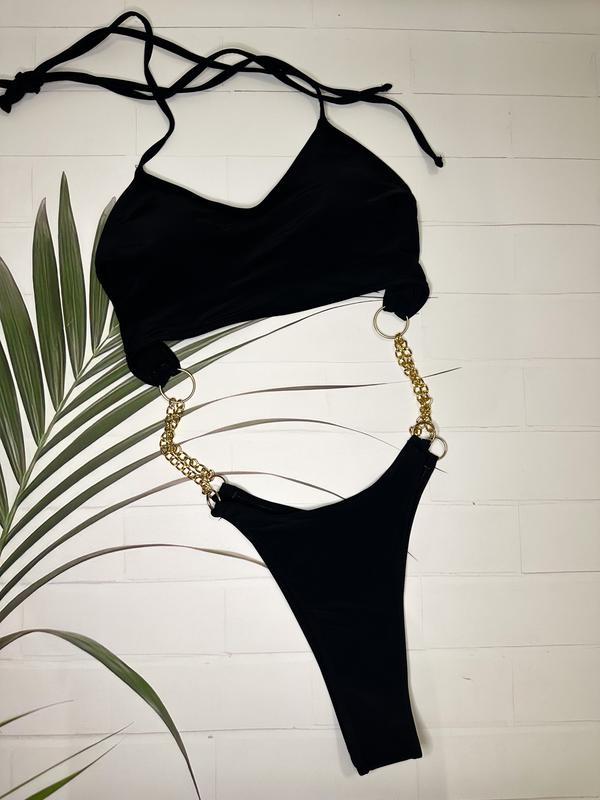 Суцільний злитий чорний купальник топ із чашками ланцюжками бразиліана