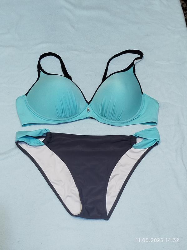 Класний купальник бірюзового кольору в гарному стані, є на бюстгальтері малопомітні точочки. Бюстгальтер 90D, бретельки регулюються, висота посадки плавок 25 см, напівобвід пояса тягнеться від 40 см до 56 см. Тканина тягнеться. Модель 6127