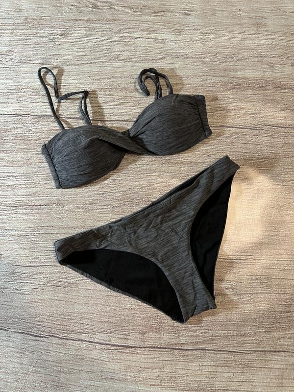 Стан ідеальний, чашечки зверху з середині оздоблені силіконом, напів обхват грудей 34( до 43 потягнеться) чашка А В, довжина лямок регулюється Плавки напів обхват 40( до 64 тягнеться) довжина 24