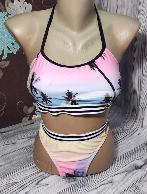 Купальник повністю на підкладці, у відмінному стані. Заміри бюста: формова поролонова знімна чашка на підкладці об'єм – 72-88 см висота чашки – 19 см ширина чашки – 19 см Плавки бікіні: пояс ПО – 38-44 см висота – 25 см Заміри зроблені у спокійному стані, тканина не просвічується.