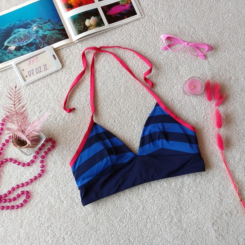 купальник тёмно-синий с небольшими нюансами , пот груди 36 47 резинка 33 41 . размер 38 высота чашечки 16 , сменные. можно задекорировать бисером. очень органично будет выглядеть полоска - как выгорела совсем небольшая . по функционалу все отлично !!!!