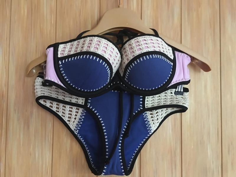 Оригінальний комбінований купальник - тканина і в"язання. Розмір: ліф 34С (75D) + плавки XS на stegna до 90см в цікавому поєднані рожевого і синього. У"пов'язані ділянки кольору беж. Чудова якість, актуальна модель! ✨ ліф на кісточках, на легкому поролоні, чашка "балконет". ✨ зьомні, широко розташовані, регульовані зав'язки ✨ плавки бікіні ✨ низька посадка Склад: Основна частина: 92% поліамід, 8% еластан. Пряжа: 100% поліестер.