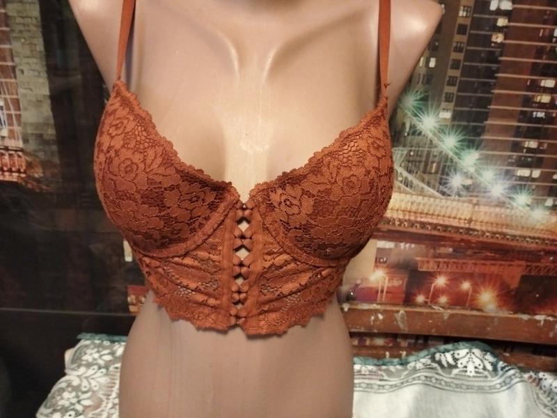 109..Бюстгальтер, коричневого кольору, мереживний, на паралоні, на кісточці, на 6 застібок, розмір 80 В (36В), етикетка зрізана, заміри є на фото,стан ідеальний