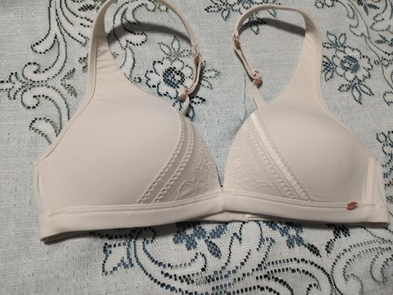 53..Бюстгальтер skiny, молочного кольору, з мереживом, на паралоні, без кісточки, розмір 70А(32А), стан майже новий