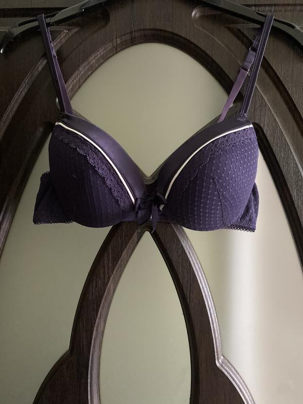 Шикарний, ажурний, базовий, бюстгальтер, з супер пуш апом, фіолетового, кольору, 👌. Дуже зручний на кожен день, красиво виглядає на грудях. Брендовоі фірми: New Look. Бірочка, з розміром, була, відрізана. Заміри чашки бюстгальтера: ширина 16 см. довжина 12 см. Розмір вказано: 34B/75B. Склад : нейлон 91%, еластину 9%. В обхваті, в спокійному, стані, 70 см. тянеться до 91 см.