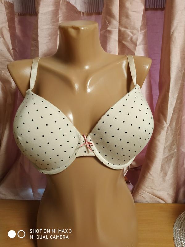 Фірмовий бежевий у чорний горошок, котоновий бюстгальтер р. 85ДД, на кісточках і поролоні. Замір чашки на фото, під грудьми 80-97 см. Секонд. Все ціле, тільки сліди носіння (см.фото).👉 Вся інформація для покупців у розділі "Обо мені"