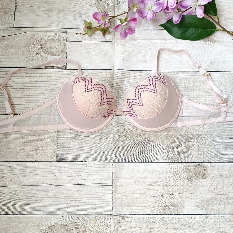 🌿 мереживний Бюстгальтер з вишивкою, оздоблений сатином. Чашки на тонкому поролоні, з невеликим пуш-апом 0.5 см. Без бічних кісточок. Пояс сітка. Бретелі незнімні, регулюються. 🌺Бирка зрізана. Це Palmers. На розмір 75 В. Заміри чашки на останньому фото. Довжина поясу 68 см, тягнеться до 83 см. (к-т)