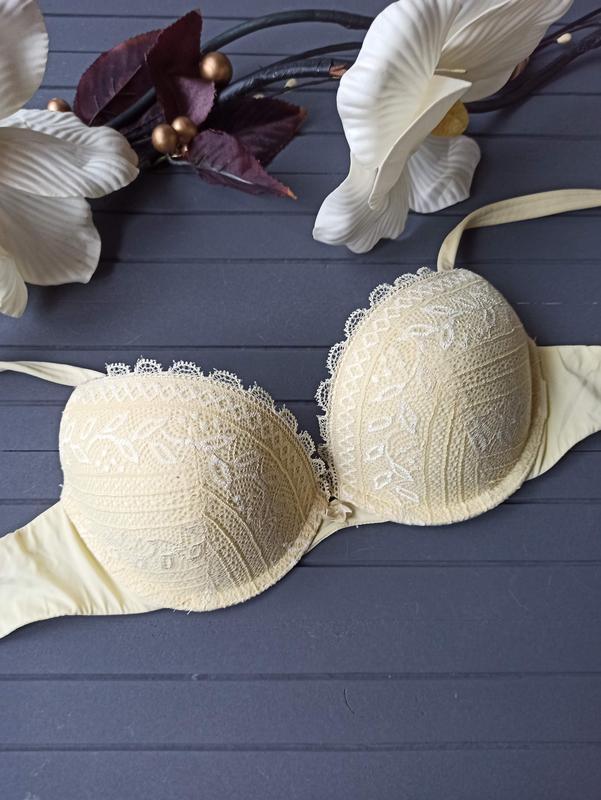 Гарний бюстгальтер із мереживними чашечками, з м'яким пушапом приблизно 1-1.5 см, пояс подвійний, гладкий, безшовний, бічних кісточок немає. Розмір 75 В, заміри на останній світлині, тягнеться до 83 см від краю до краю. Склад 45% поліамід 45% поліестер 10% еластан
