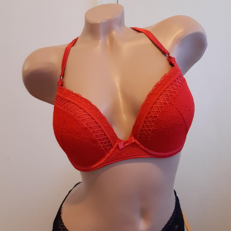 Бюстик з чашками на кісточках і поролоні, пуш-ап. Обсяг в спокійному стані - 70см, тягнеться до 80см. Висота чашки - 14см, ширина - 19 див. Колір не такий яскраво - червоний, як на фото, а більш спокійний. СТАН НОВОЇ РЕЧІ.