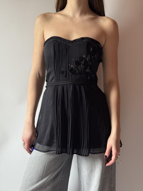 Цікавий подовжений топ Стан ідеальний Є силіконова стрічка, тому на грудях тримається добре, по боках на кісточках Розмір xs, гарно підійде на s Параметри моделі 83/62/93 600 грн