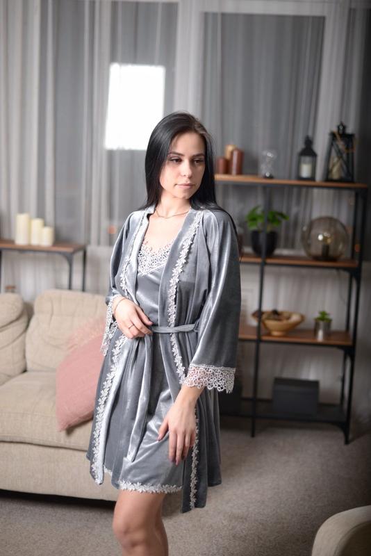 📐Розміри: піжама S(40-42),M(44-46),L(48-50) Підійде на : Груди / стегна З 80-88. /84-93 М 88-96. /94-103 Л 96-104. /104-112 🧶Матеріал - оксамит щільне Мереживо Довжина халата 85см Комбінація на регульованих бретельках .