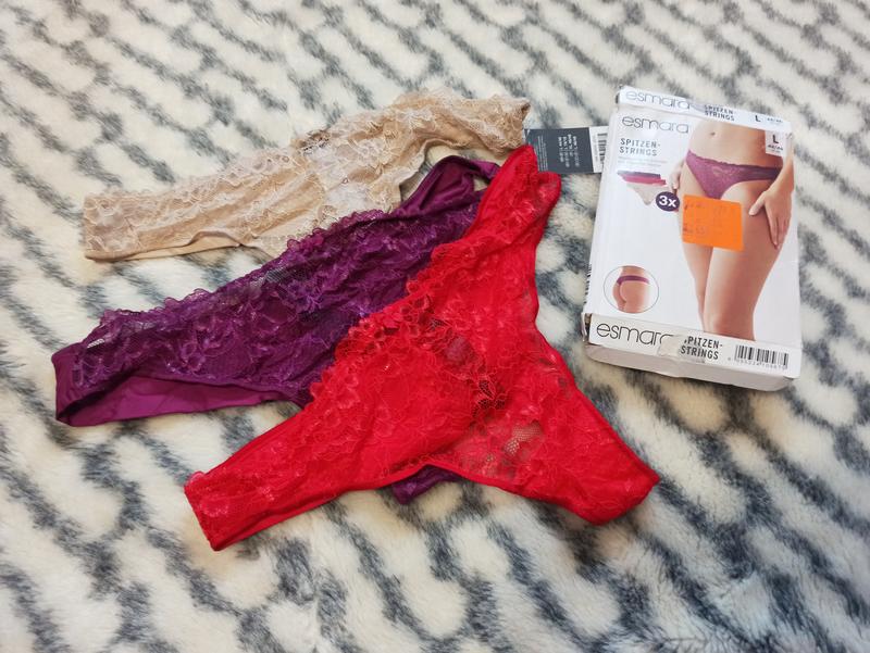 Ціна вказана за одиницю. Ціна комплекту 500 грн. В копмлекті 1 фіолетові + 1 червоні + 1 бежеві. Можливий продаж окремо. Розкішні стрінги з мереживом Esmara. Розмір - UK 16/18 EUR 44/46. Заміри: ширина по резинці 37-56 см, висота посадки 22 см. Склад: 90% поліамід, 6% еластан, 4% поліестер.
