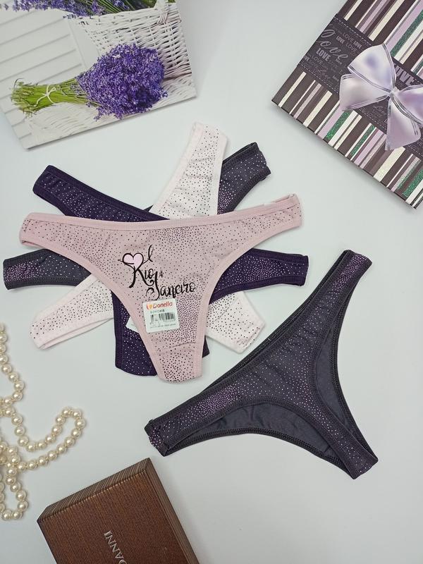 Набір трусиків стрінгів від ТМ Donella. В наборі 5 шт. Ціна вказана за набір. За потреби можна поштучно. Дуже м*які та приємні до тіла. ✅Розмір 40 на стегна 84-88 см ❌Розмір 42 на стегна 88-92 см ❌Розмір 44 на стегна 92-96 см ❌Розмір 46 на стегна 96-100 см Склад тканини 95% бавовна, 5 % еластан. Країна виробник Туреччина. На бірках вказані більші розміри, але вони не відповідають дійсності. Колір виробу може дещо відрізнятись в залежності від налаштувань Вашого пристрою. Можлива пересортиця в кольорах, але не більше 1 шт.