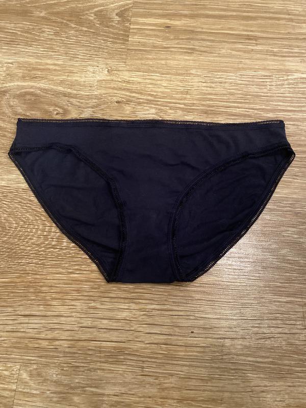 Шикарні, базові, котонові, трусики, чорного, кольору. Дуже зручні, на кожен день . Красиво, виглядає на фігурі. Брендовоі фірми: M&S . Виробник Бангладеш 🇧🇩. Розмір вказано: L. Склад : 95% котон, 5% еластін. В середині підкладка: 100% котом.