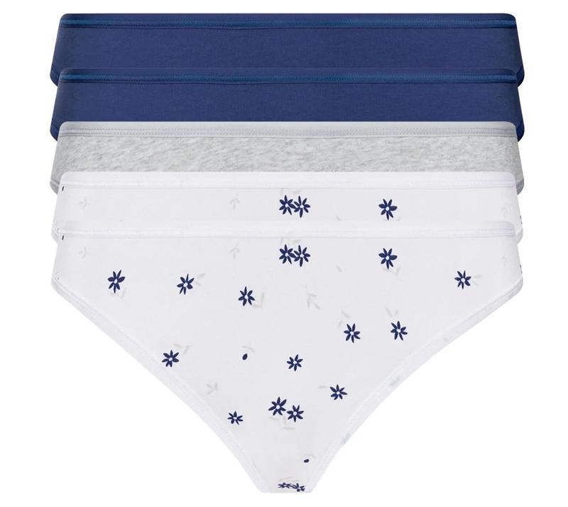 Жіночі стринги ESMARA®, 5 шт., з високим вмістом бавовни. - Приємний комфорт під час носіння завдяки високому вмісту бавовни. - Оптимальна посадка завдяки еластану LYCRA®. Колір: Синій/Сірий/Білий Склад: 95% бавовна, 5% еластан Розмір: L/XL - напівобхват талії 36,5 см, висота 22 см Інструкції з догляду - Прати за максимальної температури 40 °C. - Не відбілювати - Бережне сушіння в сушильній машині за температури не більш ніж 60 °C. - Прасувати до 150 °C (рівень 2). Можна використовувати парову праску. - Не піддавати хімічному чищенню